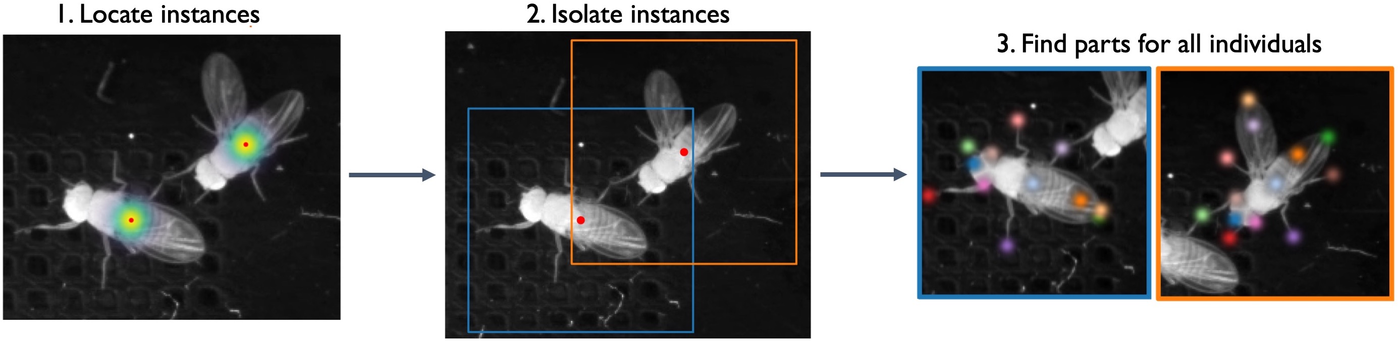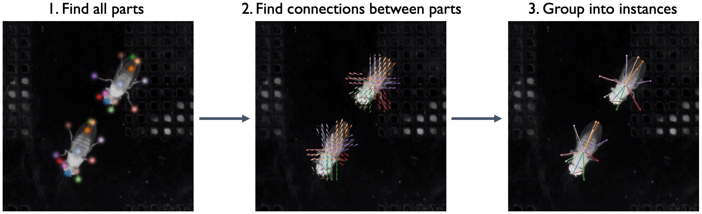 In bottom-up mode, a network first finds all of the body parts in an image, and then another network groups them into animal instances using part affinity fields (Cao et al., 2017):