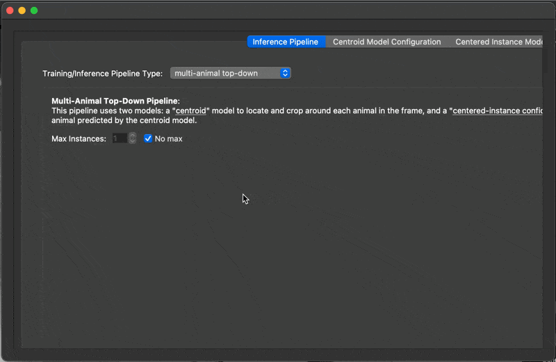 Now we just need to set up the tracking configuration. During tracking, SLEAP connects predicted instances across frames that correspond to the same animal.