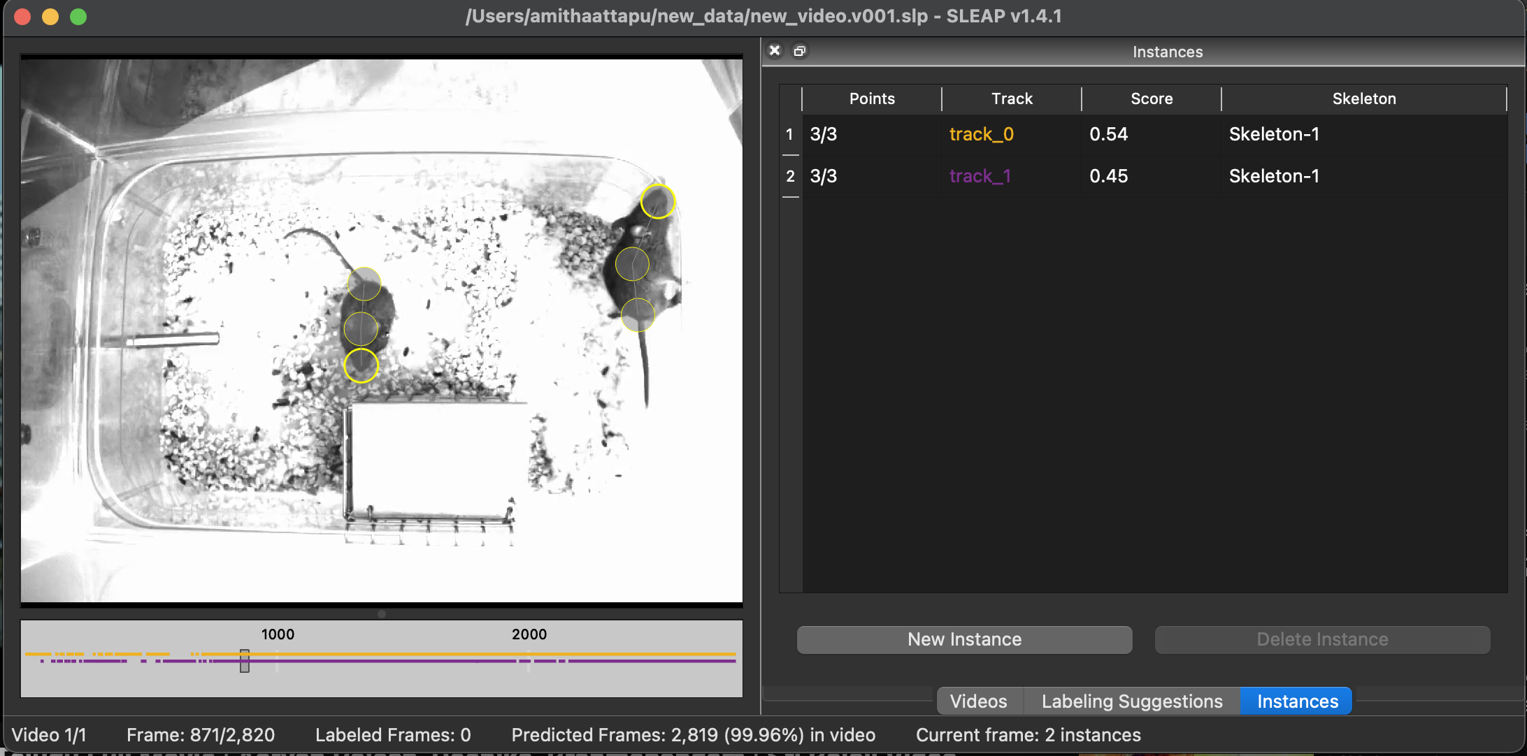 When tracking finishes you'll see predicted instances overlaid on the animals across the entire video: