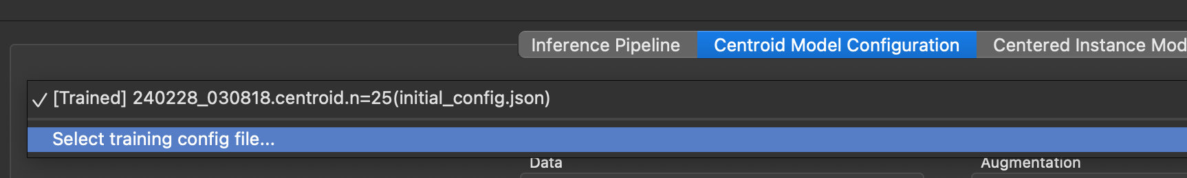 modelssubfolder of the project folder. To change it, click over to the Centroid Model Configuration tab, then click Select training config file... from the dropdown menu at the top: