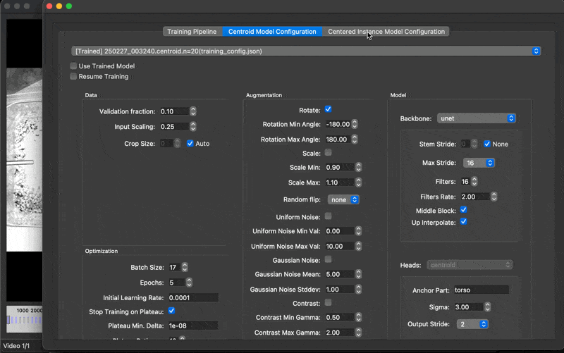 (number of training images) / (batch size)or200batches. With larger dataset sizes, one epoch is one pass over the training data. Normally, SLEAP will stop training early when a plateau is detected in the validation loss to prevent overfitting, but since we're training with a single image, we'll set this manually to enable a quick and dirty training run. ↩ -