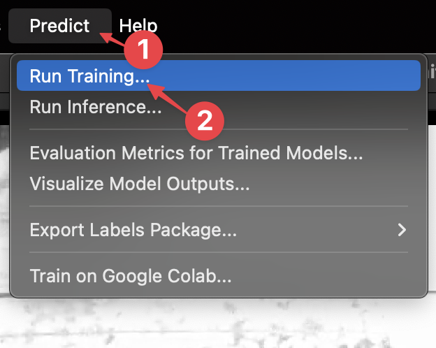 In the menu bar at the top, click Predict → Run Training... to open the training pipeline configuration window.